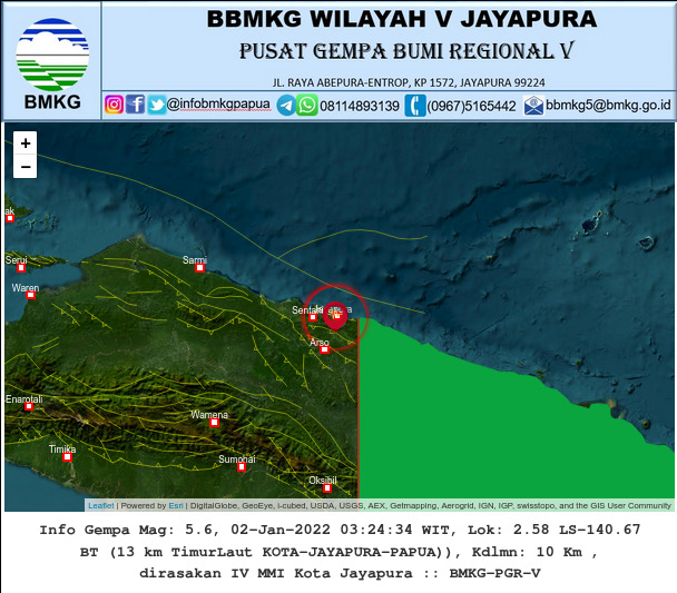 Data dari Badan Meteorologi Klimatologi dan Geofisika (BMKG) wilayah V Jayapura gempa berkekuatan 5,6 magnitudo terjadi di kedalaman 10 km dan 13 km timur laut Kota Jayapura Provinsi Papua.
