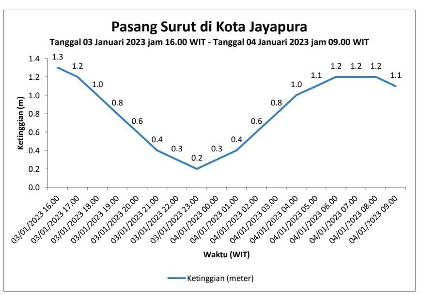 “Stasiun Meteorologi Maritim Dok II Jayapura dengan ini menyampaikan hal-hal berikut yaitu Kondisi pasang surut air laut di wilayah Kota Jayapura saat ini sedang menuju surut dengan puncak surut air laut pada tanggal 03 Januari 2023 pukul 23.00 WIT dengan ketinggian mencapai 0.2 meter. Setelah itu, kondisi ketinggian muka air laut akan naik menuju puncak pada tanggal 04 Januari 2023 pukul 07.00 WIT dengan ketinggian 1.2 meter (gambar grafik), “jelasnya dalam rilis resmi yang disampaikan. Selasa (3/1)