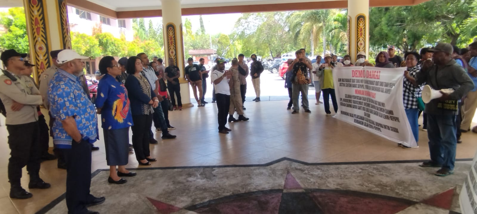 Puluhan orang tersebut melaksanakan aksi demo saat tiba di Kantor Bupati Jayapura itu diterima oleh Asisten I Bidang Pemerintahan Umum Setda Kabupaten Jayapura Elphyna D. Situmorang didampingi Asisten II Bidang Perekonomian Delila Giay dan Asisten III Bidang Administrasi Umum Jhon Wiclif Tegai.