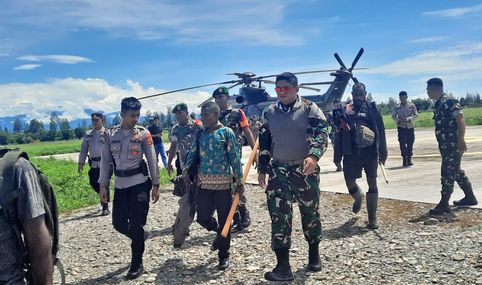 “Evakuasi dilakukan dengan menggunakan Helly Karakal TNI AU EC-725/HT-7201 yang dipiloti oleh Mayor Pnb Arif Khoirudin dengan jumlah personel penyelamatan sebanyak 6 orang dipimpin Brigjen TNI Juintah O. Sembiring (Dandrem 172/PWY),” ungkapnya.