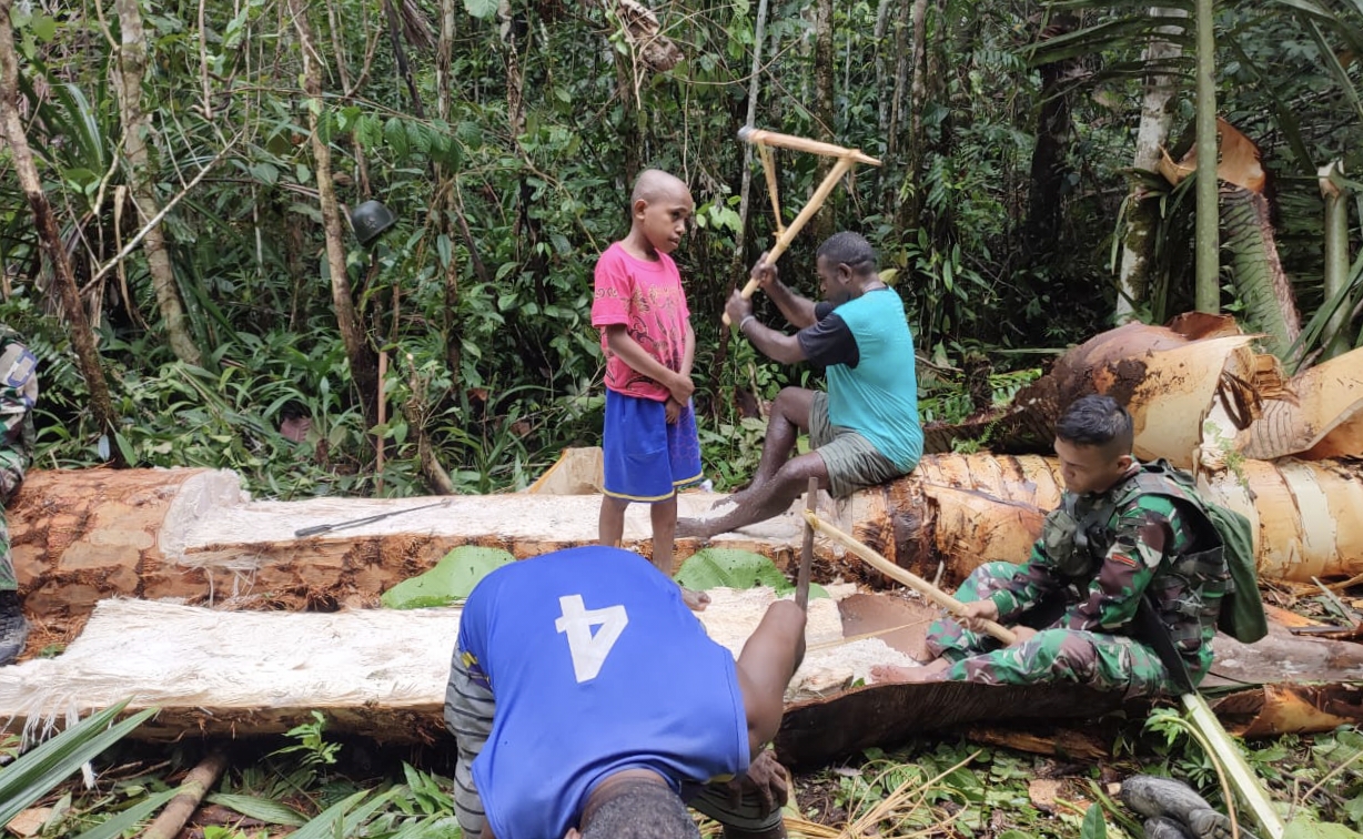 Paraparatb.id | Maybrat | Dalam rangka pemenuhan ketersediaan bahan pangan dan meningkatkan perekonomian masyarakat, prajurit TNI Pos Imsun Satgas Yonif 133/YS membantu warga untuk Tokok (panen) Sagu dengan alat tradisional di Kampung Imsun, Distrik Aifat Selatan, Kabupaten Maybrat-Papua Barat Daya, Jumat, 28 Juli 2023.