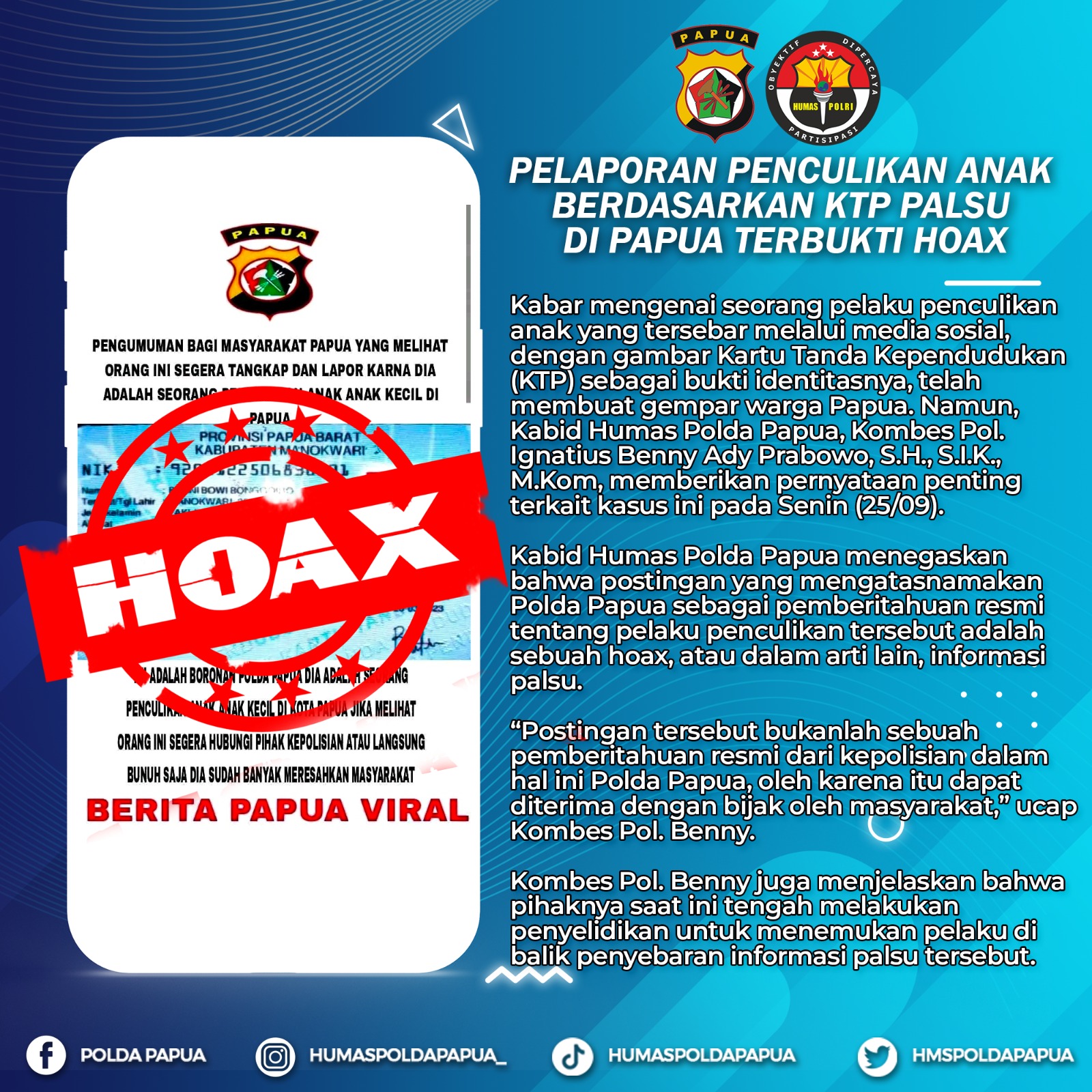 Paraparatv.id | Jayapura | Kabar mengenai seorang pelaku penculikan anak yang tersebar melalui media sosial, dengan gambar Kartu Tanda Kependudukan (KTP) sebagai bukti identitasnya, telah membuat gempar warga Papua. Namun, Kabid Humas Polda Papua, Kombes Pol. Ignatius Benny Ady Prabowo, S.H., S.I.K., M.Kom, memberikan pernyataan penting terkait kasus ini pada Senin (25/09).
