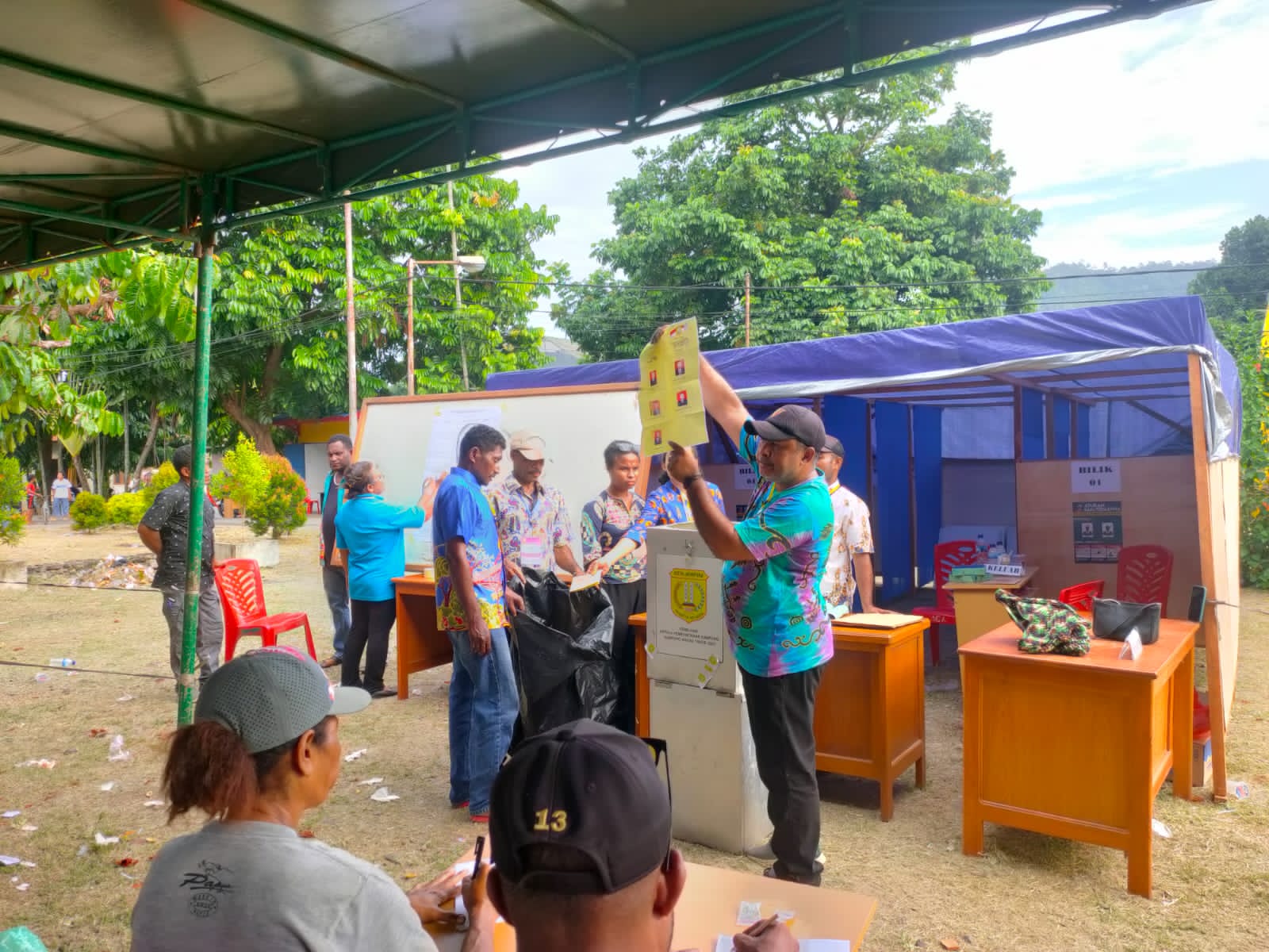 Ketua Panitia Pemiliah Kepala Kampung Waena Kedor Moudw menjelaskan proses pemilihan yang di ikuti oleh kelima bakal calon Kepala Kampung yang pada hari ini menjalani pemilihan telah melalu beberapa tahapan proses seleksi yang di lakukan panitia antara lain tahapam pendaftaran pada 11 – 20 september 2023 lalu.