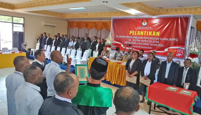Paraparatv.id | Yapen | Menjelang pemungutan suara pada Pemilu 2024, Panitia Pemilihan Distrik (PPD) Yapen Selatan melantik 721 anggota Kelompok Penyelenggara Pemungutan Suara (KPPS) se – Distrik Yapen Selatan untuk di tempatkan di 103 TPS di daerah Pemilihan 1 Distrik Yapen Selatan. Bertempat di aula Hotel Kelapa Dua Serui. Kamis (25/1/24).