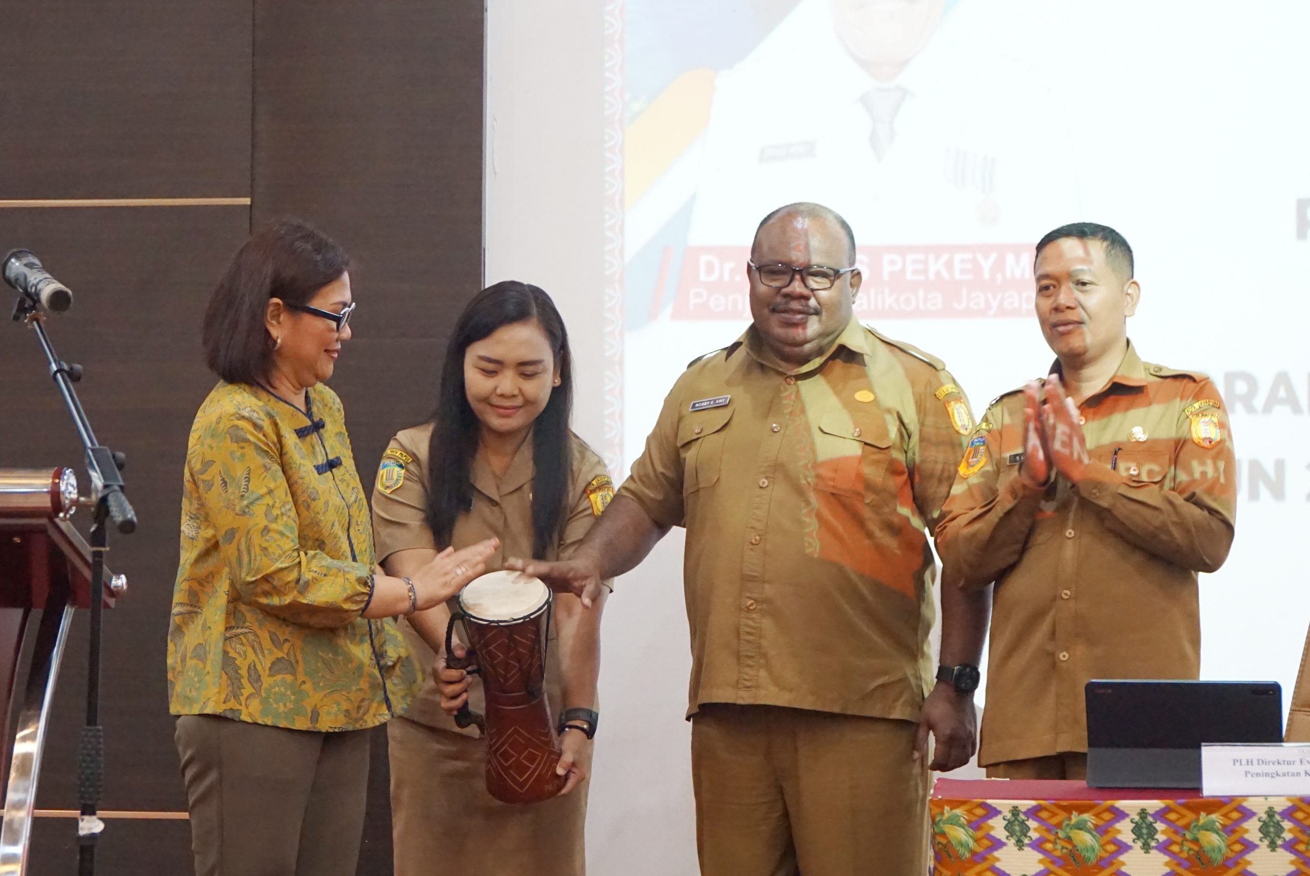 Penabuan Tifa secara bersama Pj Sekda kota Jayapura Robby K.Awi, pemateri dari Kementerian Dalam Negeri Ibu Imelda dan kabag Pemerintahan setda Kota Jayapura, Supriyanto.