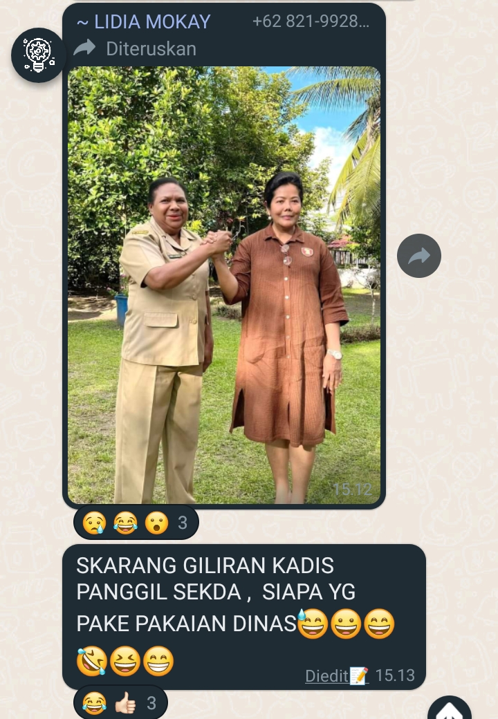 Lidia Mokay pengunggah foto tersebut dalam caption nya menuliskan “Sekarang giliran Kadis panggil Sekda, siapa yang pake pakaian dinas” tulis Lidia dalam caption foto itu disusul dengan sejumlah emoji tertawa.