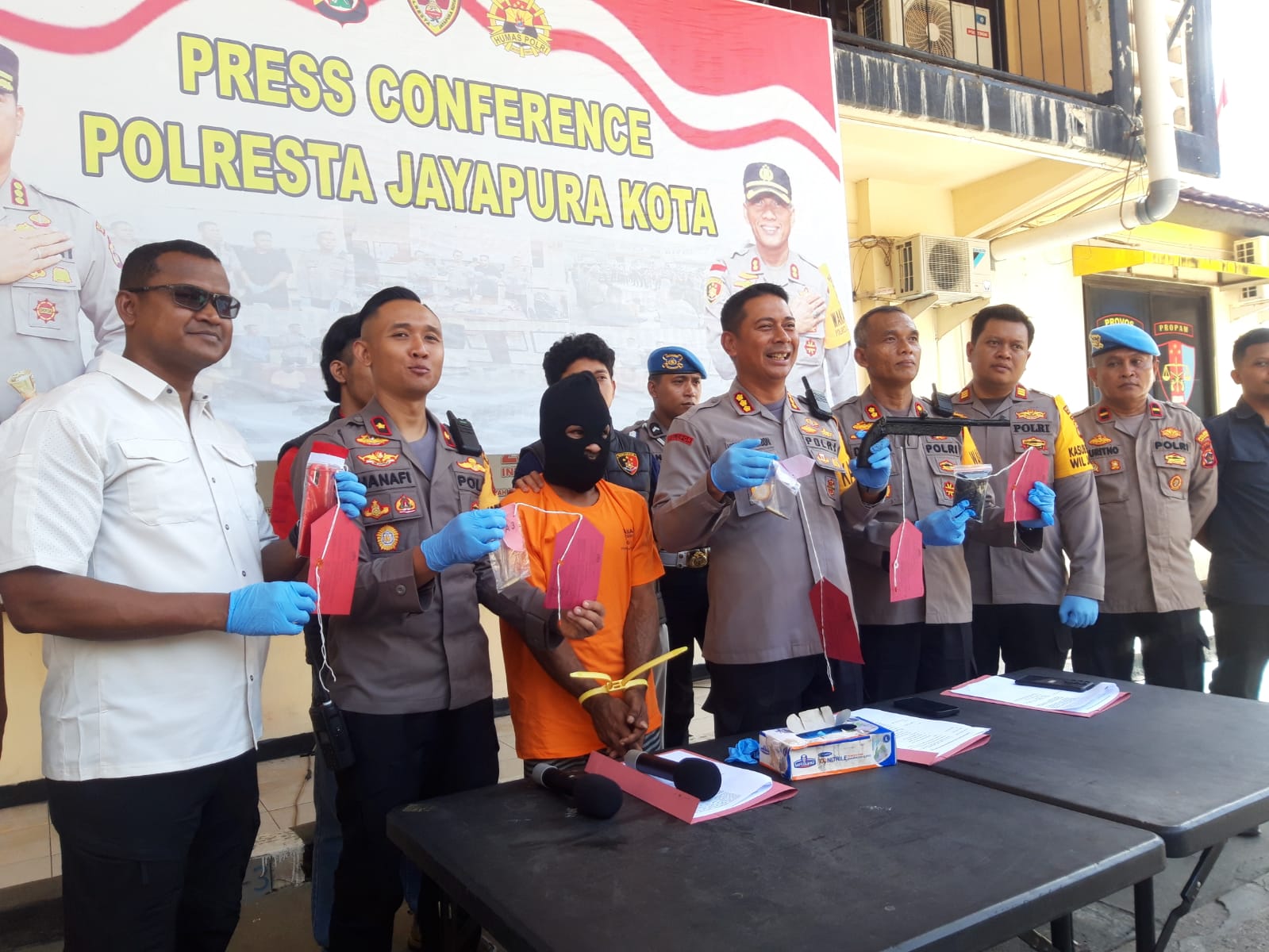 Kapolresta Jayapura Kota Kombes Pol Dr. Victor D. Mackbonsaat menggelar Press Conference di Mapolresta, Sabtu (30/3) pagi. mengatakan, pengungkapan kasus yang direlease merupakan keberhasilan dari Unit Reskrim Polsek Jayapura Selatan dan Sat Reskrim Polresta Jayapura Kota