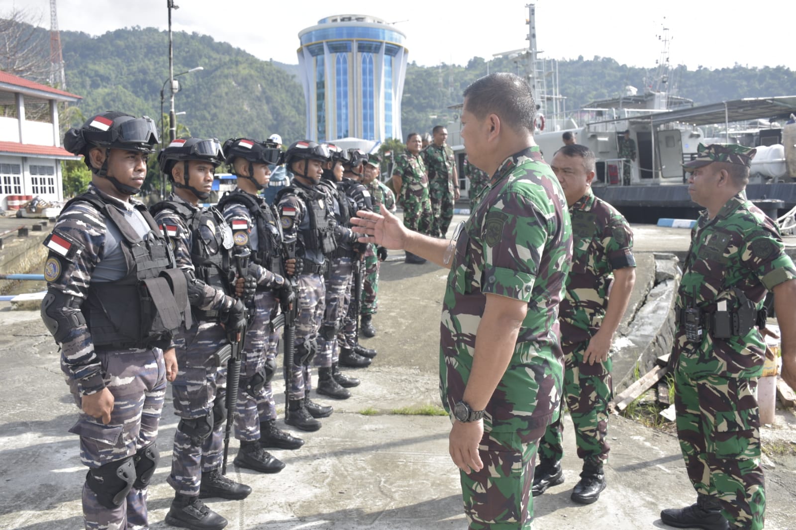 Laksda TNI Hersan, S.H., M.Si., M.Tr.Opsla bersama Komandan Lantamal X Jayapura Brigjen TNI (Mar) Ludi Prastyono, M.Tr.Opsla didampingi Letkol Laut (P) Dedy Obet saat mengunjungi Satrol Lantamal X Jayapura di jalan Sam Ratulangi, Kelurahan Gurabesi, Distrik Jayapura Utara, Kota Jayapura – Papua. Rabu, (29/5/2024).