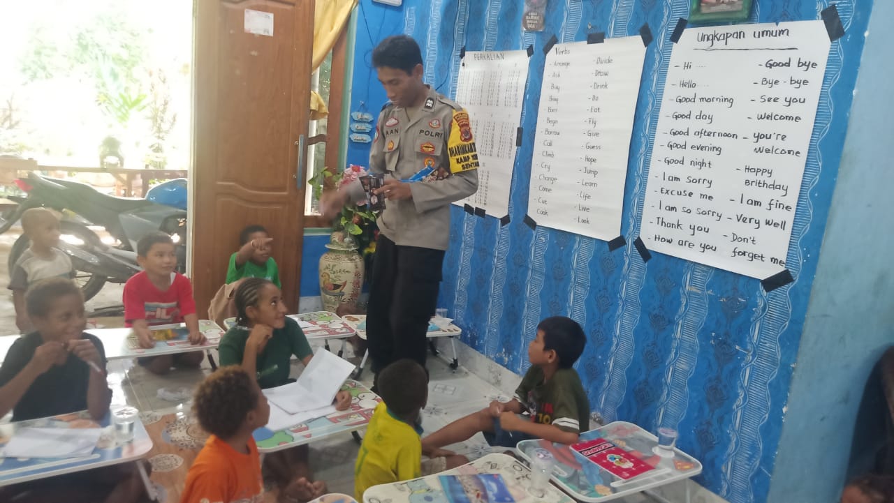 Paraparatv.id | Sentani | Anggota Bhabinkamtibmas Polsek Kawasan Bandara Sentani Konsisten menjalankan program Gerakan Baca Tulis (Gabus).
