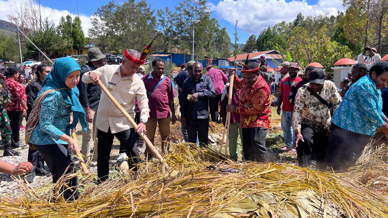 Usai memberikan sambutan Pj Gubernur bersama Pj Bupati Lanny jaya membuka bakar batu yang telah disiapkan masyarakat.(GR)