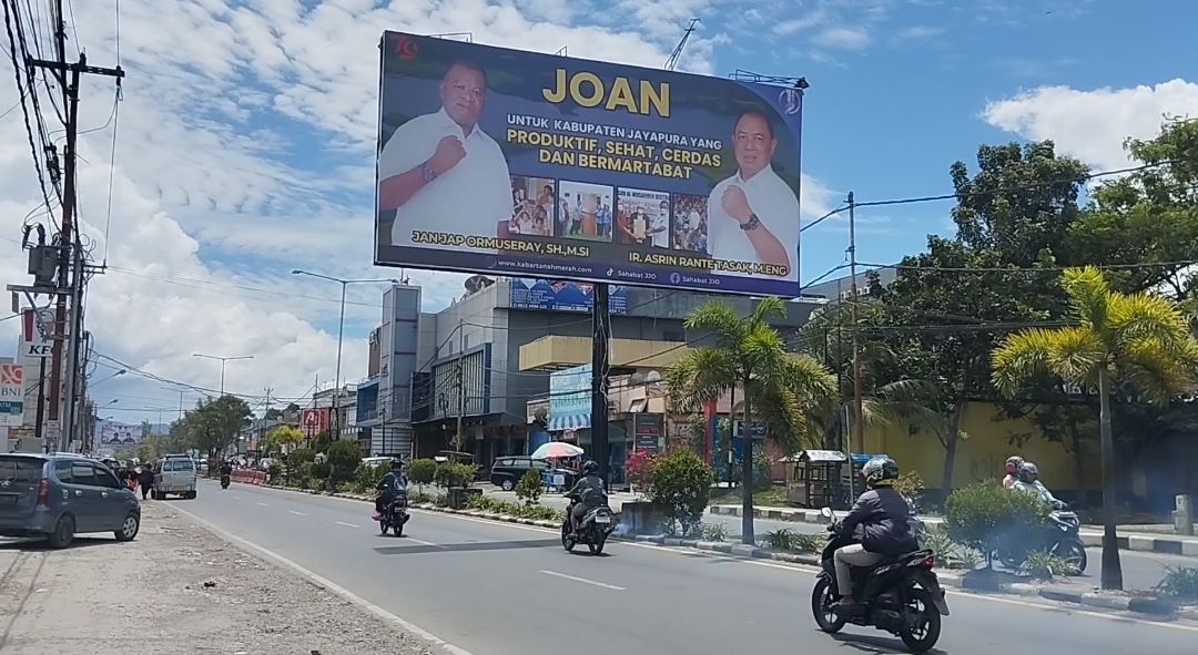 Baliho salah satu pasangan bakal calon bupati-wakil bupati Kabupaten Jayapura yang terpampang di Pusat Kota Sentani. Foto : Ari Bagus Poernomo