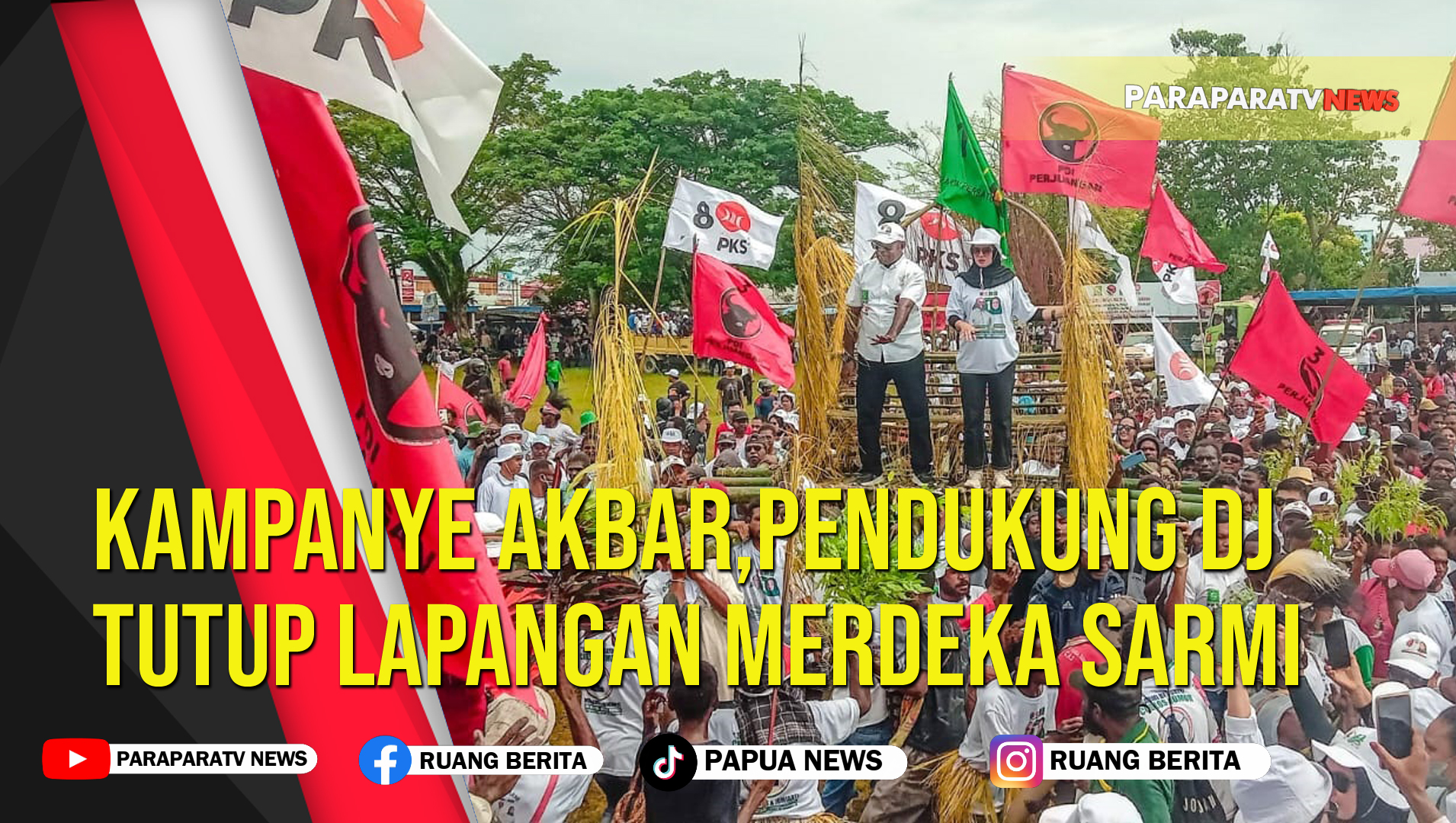 ParaparatvNEWS | VIDEO | Pasangan Calon Bupati dan Wakil Bupati Sarmi nomor urut 1, Dominggus Catue, dan wakil bupati H. Jumriati, SH atau disingkat “DJ” Mengakhiri masa kampanyenya di pilkada sarmi di lapangan merdeka kabupaten Sarmi, Sabtu, 23 November 2023.