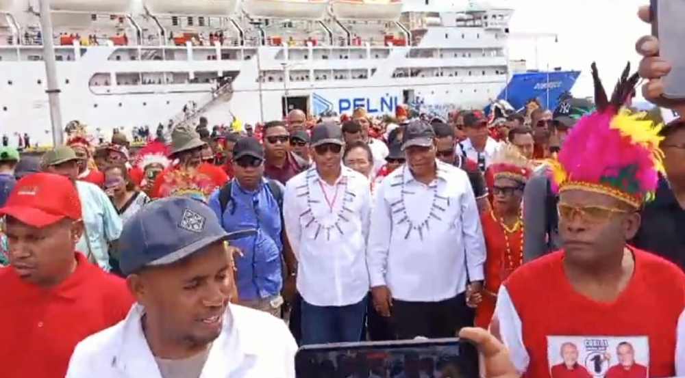 Kedatangan BTM didampingi Istri dan rombongan di Pelabuhan Serui disambut antusias oleh masyarakat yang tumpah ruah, memberikan dukungan penuh dalam kampanye akbar perdana pasangan BTM-YB. Rabu (13/11/2024).