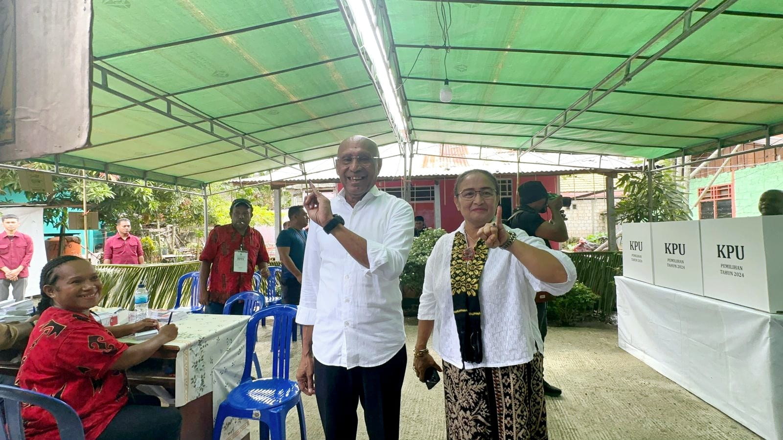 Paraparatv.id | Jayapura | Calon Gubernur Provinsi Papua Benhur Tomi Mano dan Istri menggunakan hak suara atau mencoblos di tempat pemungutan suara (TPS) 04 Kelurahan Wahno,Jalan Jeruk Nipis Kotaraja,Distrik Abepura,Kota Jayapura,Provinsi Papua Rabu (27/11/2024).