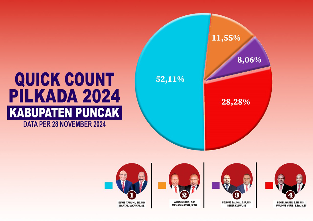Paraparatv.id | Jayapura | Berdasarkan hasil hitung cepat atau quick count Pilkada Puncak oleh beberapa sumber, dipastikan pasangan Calon Bupati-Wakil Bupati Elvis Tabuni-Naftali Akawal memperoleh suara tertinggi mencapai 52,11%.