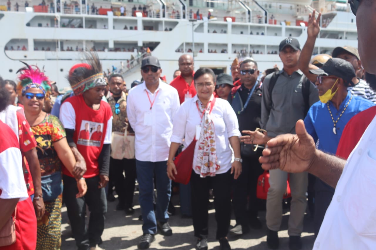 Paraparatv.id | Yapen | Calon gubernur papua Benhur Tomy Mano yang di dampingi langsung oleh istri beserta tim, dengan menggunakan KM. Dobonsolo tiba di pelabuhan laut Serui, guna melakukan kampanye bersama masyarakat pada tahapan Pilkada 2024. Rabu (13/11/24).