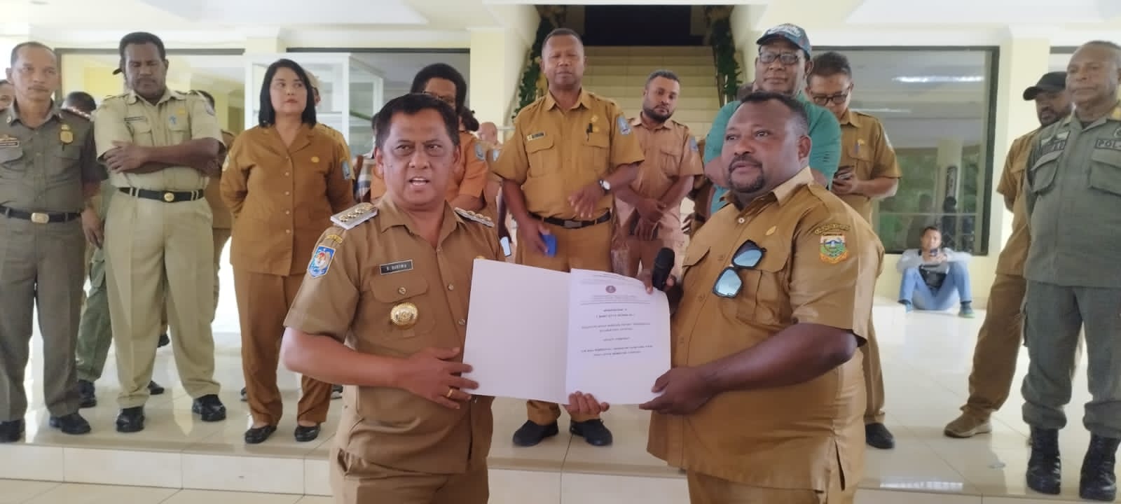 Paraparatv.id | Sentani | Jack Judzoon Puraro selaku koordinator aksi demo ASN di lingkungan Pemerintah Kabupaten (Pemkab) Jayapura menyerahkan aspirasi atau pernyataan sikap kepada Penjabat (Pj) Bupati Jayapura Semuel Siriwa, Selasa, 14 Januari 2025.