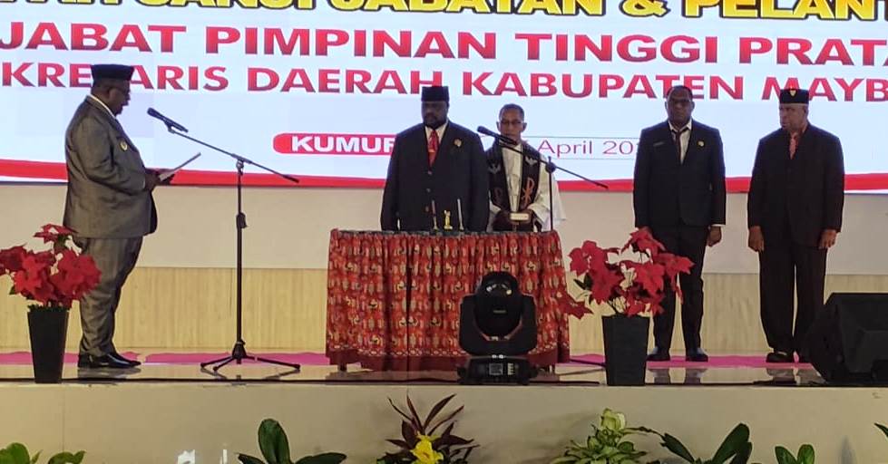 Paraparatv.id | Maybrat | Pejabat Pimpinan Tinggi Pratama di lingkungan Pemerintah Kabupaten Maybrat kini resmi ditetapkan dalam agenda Pengambilan Sumpah Janji Jabatan dan Pelantikan Sekretaris Daerah di gedung Samu Siret, Kumurkek, Kamis, (17/4/2025).