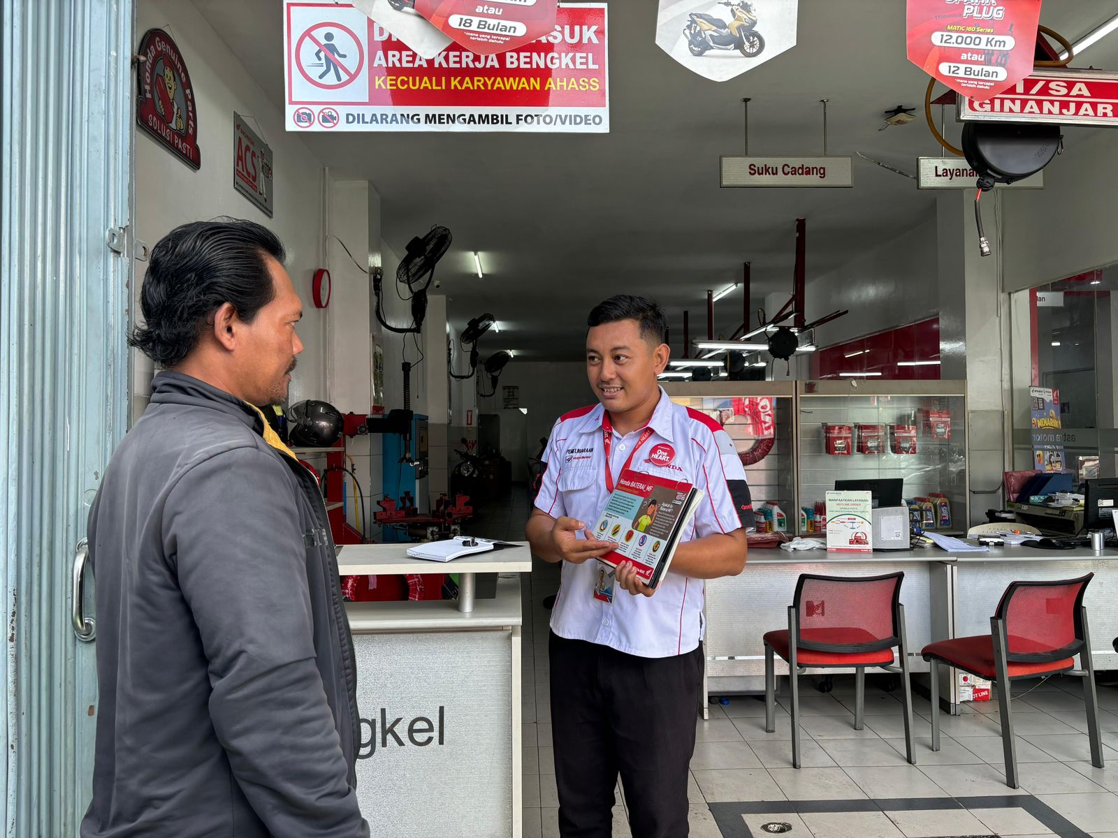 Tampak dalam dokumentasi di Dealer Astra Motor Tanah Hitam, seorang petugas Honda menyambut konsumen pengendara motor dengan penuh keramahan, memberikan arahan secara langsung di pintu masuk. Pendekatan seperti ini menunjukkan komitmen Honda dalam mengutamakan pelayanan humanis dan koneksi emosional dengan konsumen.