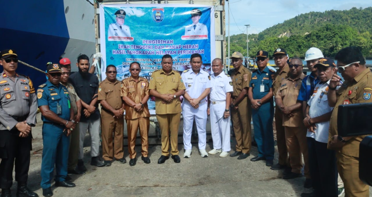 Paraparatv.id | Yapen | Pemerintah Daerah Kabupaten Kepulauan Yapen mengirim ikan tenggiri dan kakap merah hasil tangkapan masyatakat seberat 14.000 kilogram atau 14 ton ke pelabuhan Tanjung Priok, Jakarta, yang di tandai dengan pengguntingan pita oleh Bupati Yapen Benyamin Arisoy di dampingi oleh Wakil Bupati Yapen Roi Palunga serta beberapa pimpinan OPD lainnya. Bertempat di pelabuhan Domine Izak Samuel Kijne, Serui, Selasa (20/5/25)