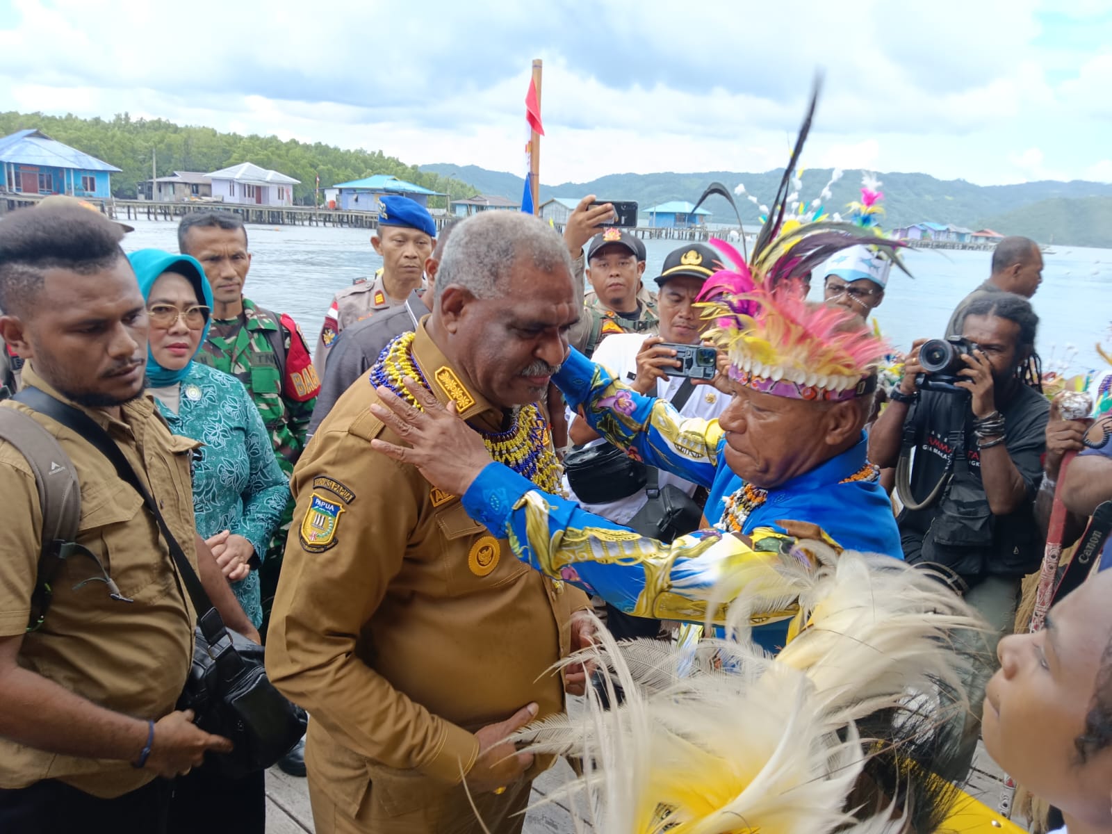 Wali Kota Jayapura, Abisai Rollo S. H, M. H saat di sambut masyarakat adat kampung Enggros