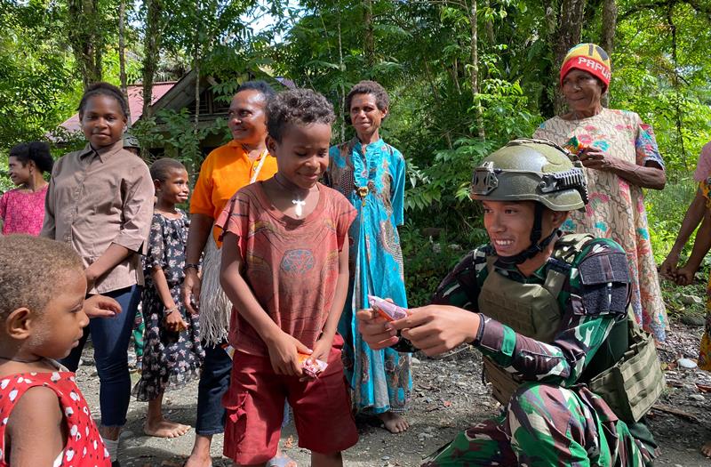 “Beta senang sekali lihat anak-anak tertawa. Terima kasih TNI sudah datang bawa senyum dan kasih untuk anak-anak di sini,”Ujarnya