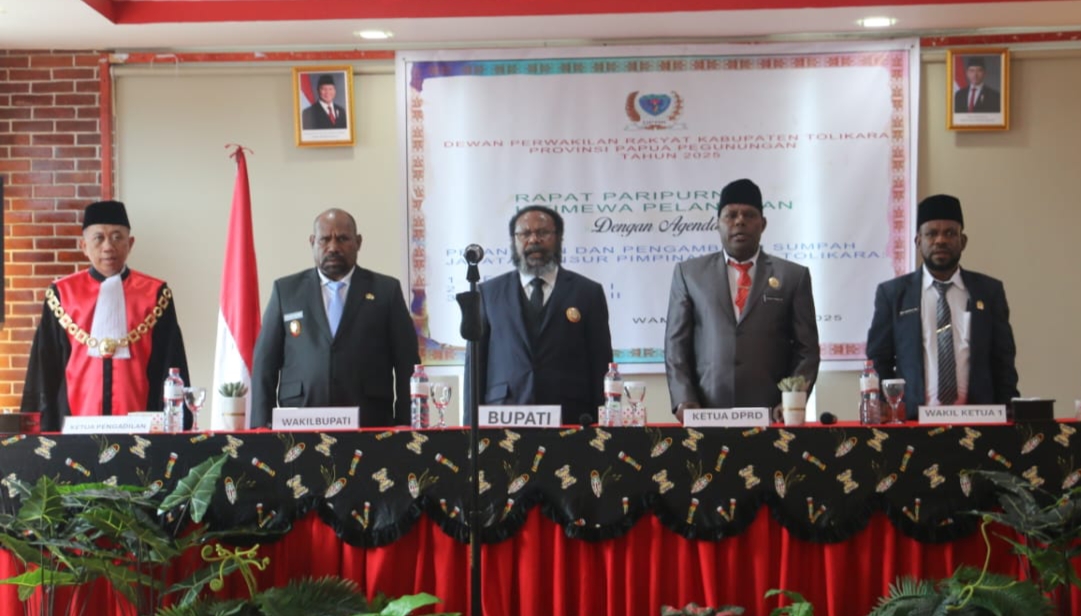 Paraparatv.id | Wamena | Pimpinan definitif Dewan Perwakilan rakyat Kabupaten (DPRK) Tolikara secara resmi dilantik dan diambil sumpah/janji jabatan oleh Ketua Pengadilan Tinggi Wamena, Hirmawan Agung Wicaksono, SH.,MH dalam Rapat Paripurna Istimewa di Hotel Grand Baliem Wamena, Kamis 19 Juni 2025.