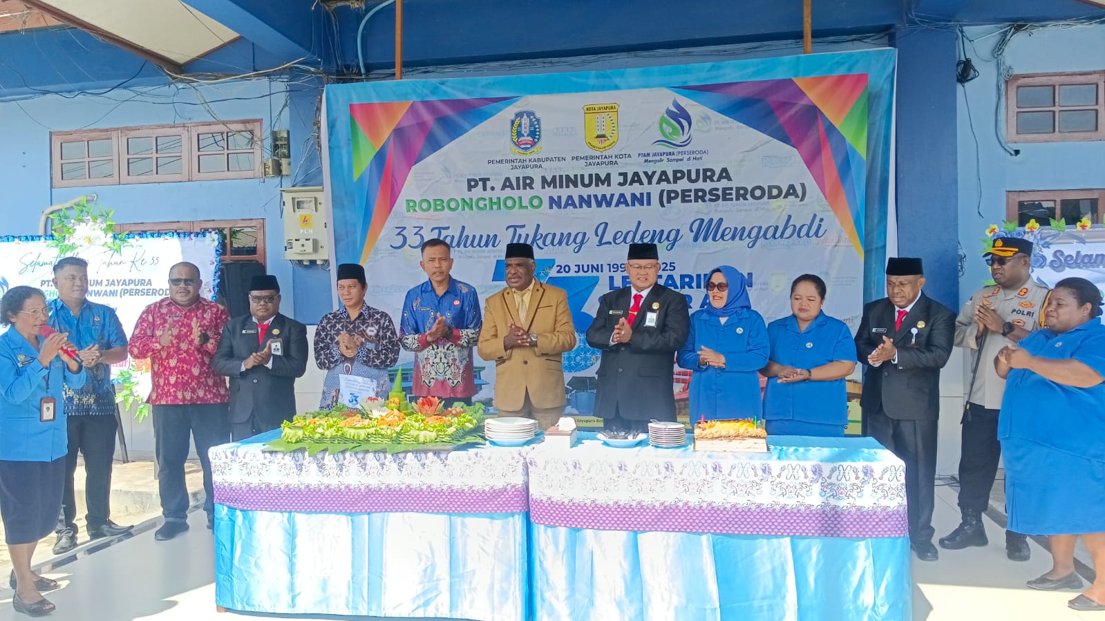 Paraparatv.id |Jayapura | PT. Air Minum Jayapura (AMJ) Robongholo Nanwani (Perseroda) memasuki usia Ke-33 tahun dengan mengusung tema Lestarikan Sumber Air untuk Masa Depan, perayaan HUT diawali dengan upacara dan dirangkai dengan syukuran pemotongan tumpeng di Halaman Kantor Pusat PT. AMJ Robongholo Nanwani, Entrop Kota Jayapura. Jumat (20/06).