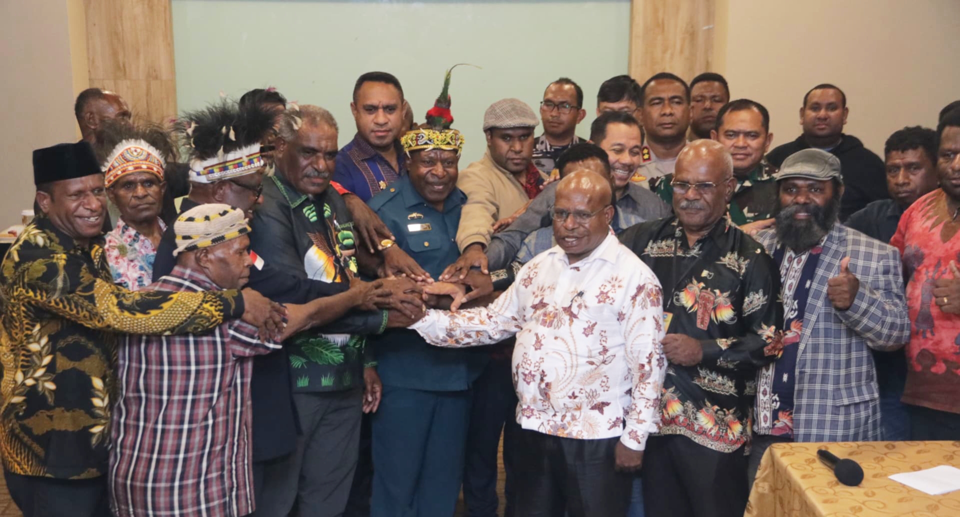 Pertemuan tersebut dihadiri oleh tokoh adat, tokoh pemuda, tokoh agama, tokoh intelektual dari wilayah Lapago dan Meepago, serta perwakilan Forkopimda, termasuk Wakil Wali Kota, Dandim, Kapolres, Ketua Pengadilan, dan Asisten I dari Pemerintah Kabupaten Jayapura.
