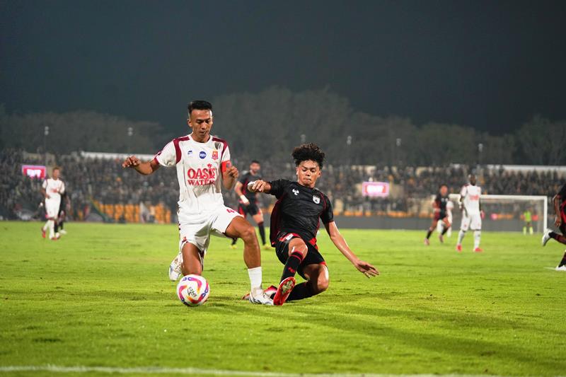 Rino Salampessy (Kanan) saat berjibaku merebut bola saat laga Uji Coba bersama Tim Promosi Liga 1 Indonesia Persijap, di stadion Gelora Bumi Kartini, Jepara , sabtu 26 Juli 2025