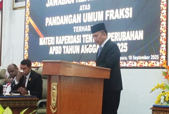 Paraparatv.id | Jayapura | Penjabat Gubernur Papua, Dr. Drs. A. Fatoni, M.Si., menyampaikan jawaban pemerintah provinsi terhadap pandangan umum fraksi-fraksi DPR Papua terkait Rancangan Peraturan Daerah Tentang APBD Perubahan (APBD-P) Tahun Anggaran 2025 pada Sidang Paripurna DPR Papua, Kamis (18/9/2025).