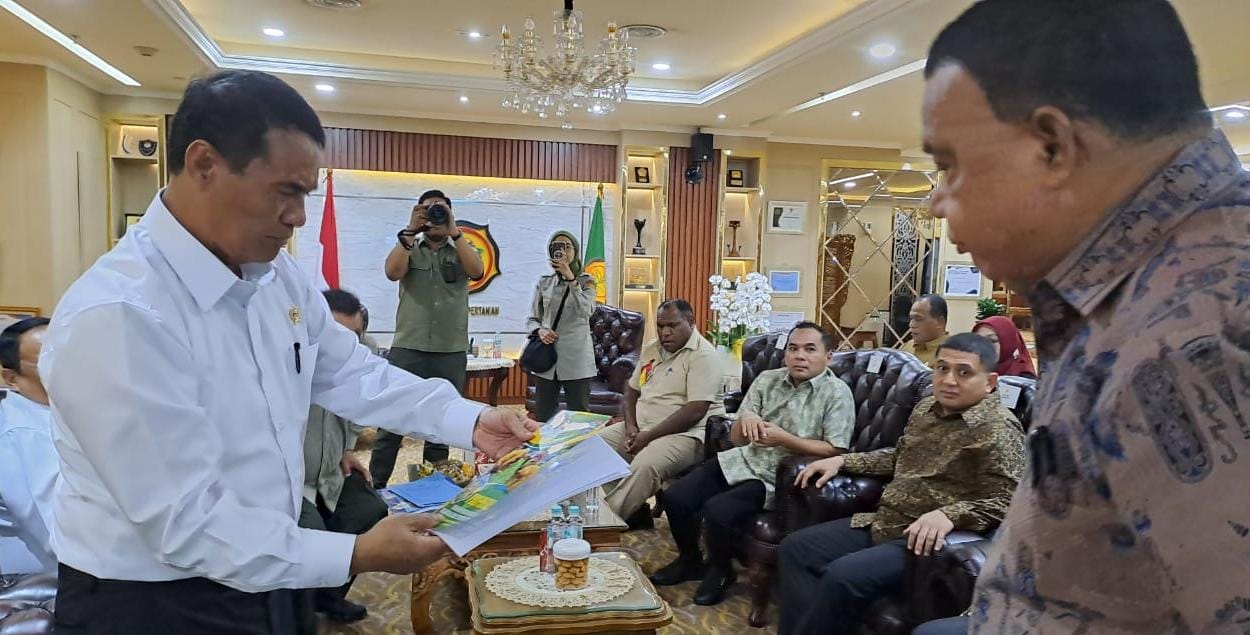 Bupati Yapen Benyamin Arisoy yang di dampingi oleh Wakil Bupati Yapen Roi Palunga, saat melakukan pertemuan bersama dengan Menteri Pertanian (Mentan) Andi Amran Sulaiman, juga menyerahkan secara langsung proposal pertanian yang di terima langsung oleh Menteri Pertanian. Kamis (9/10/25).