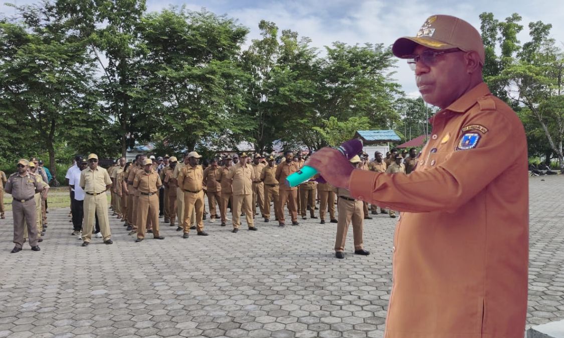 Paraparatv.id | Mamberamo Raya | Bupati Mamberamo Raya Roby Rumansara,SP,MH, memimpin apel ASN di halaman Dinas Perhubungan diburmeso, Senin (24/11/2025), dan memberikan pesan tegas kepada seluruh pimpinan OPD untuk dapat mendelegasikan tugas kepada staf agar pelayanan pemerintahan berjalan cepat dan profesional.