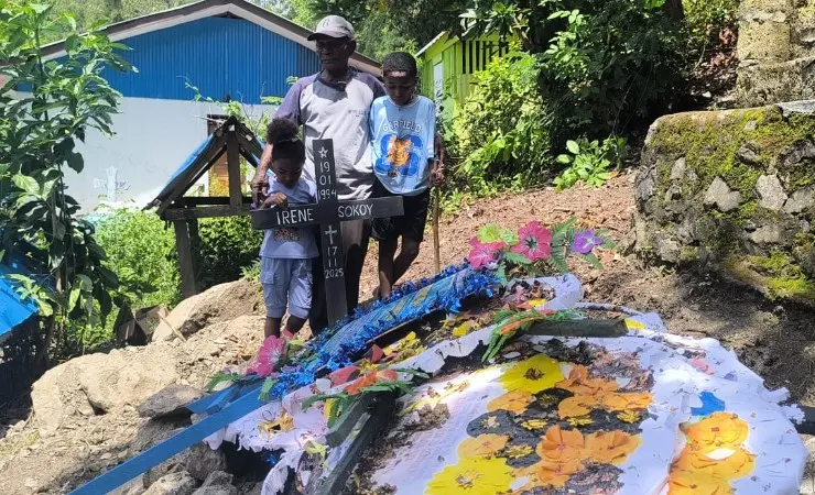 Suasana haru saat keluarga berdiri di samping makam Irene Sokoy di Sentani, Papua. Irene dan bayinya meninggal setelah tidak mendapatkan layanan medis yang memadai dari beberapa rumah sakit. Tragedi ini memicu kemarahan Gubernur Papua dan mendesak evaluasi total pelayanan kesehatan di Kabupaten Jayapura. Foto : Firga/Seputarpapua