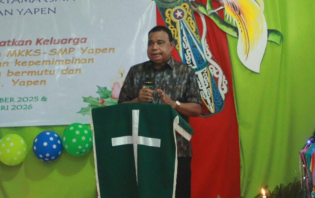 Paraparatv.id | Yapen | Bupati Yapen Benyamin Arisoy,menghadiri natal bersama dengan keluarga besar Musyawarah Kerja Kepala Sekolah (MKKS) se Kabupaten Kepulauan Yapen. Bertempat di aula SMP Anotaurei. Jumat (12/12/25).