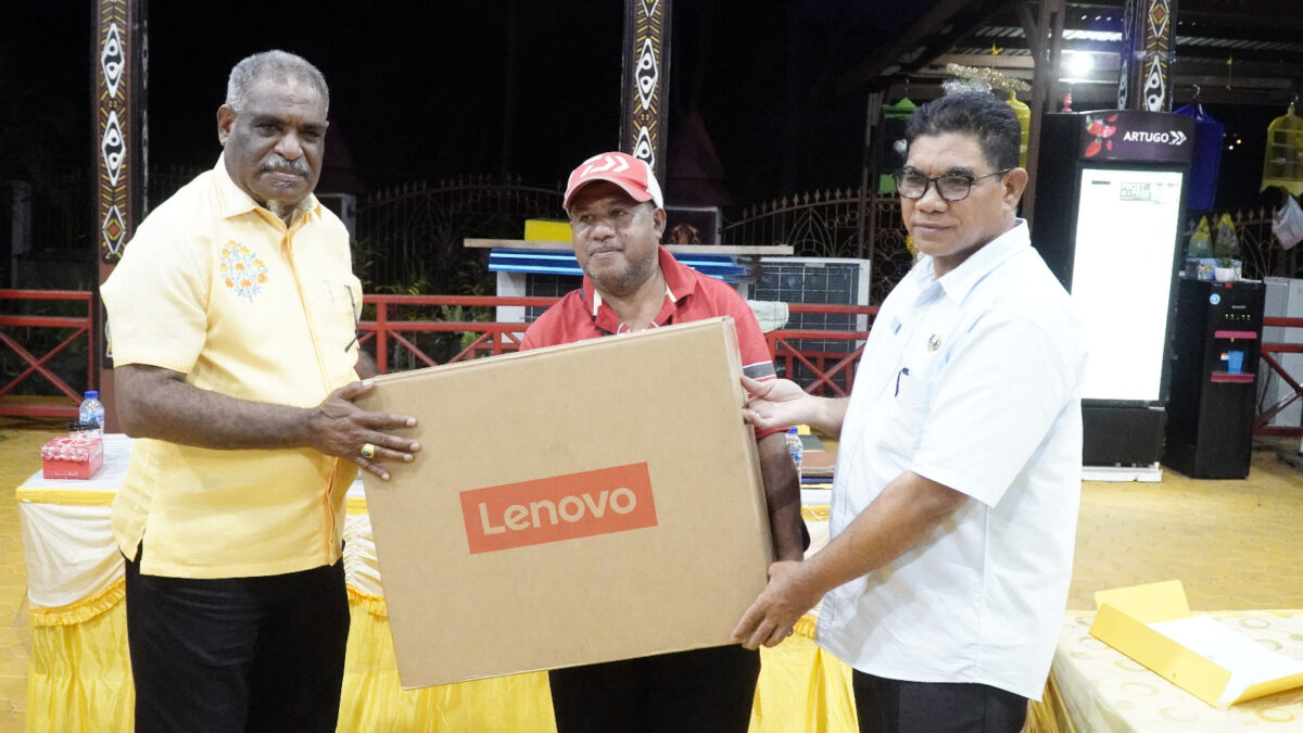 Wali Kota Jayapura, Abisai Rollo ( kiri) didampingi Plt Sekda Muchlis Karim saat menyerahkan 1 unit Komputer ke Kepala Kelurahan Bhayangkara di rumah jabatan Wali kota, Jumat malam 5 Desember 2025