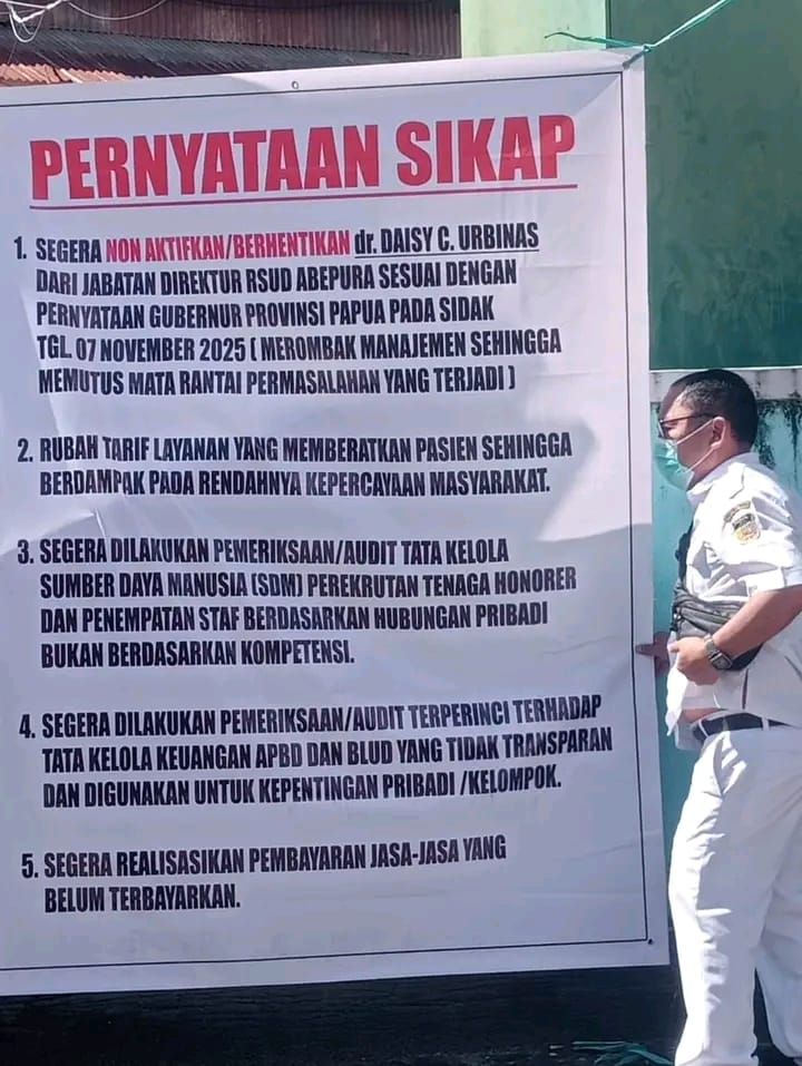Menurutnya aksi yang di lakukan didepan Gedung RSUD Abepura Selasa , (27/1/2026) dengan membentangkan spanduk bertuliskan pernyataan sikap. Salah satu point nya adalah meminta direktur RSUD Abepura dinonaktifkan.